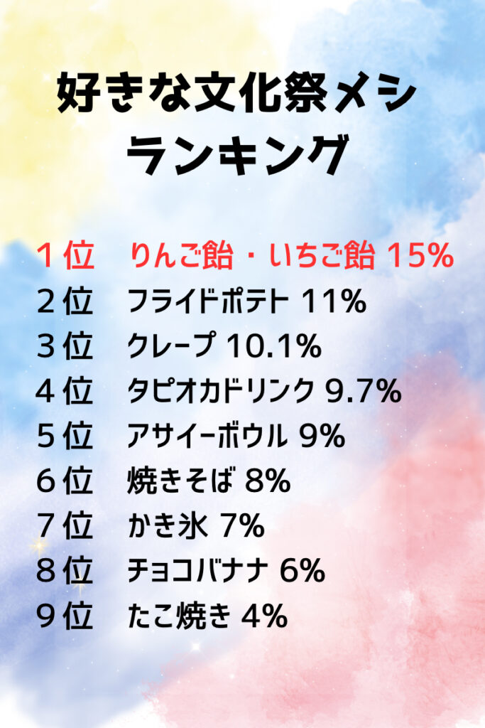 好きな文化祭メシ、王道のフライドポテトやクレープを抑え1位になったのは“りんご飴・いちご飴”。美味しさはもちろん、キラキラした見た目はSNS映えもバツグン♡食べ歩きしてるだけで文化祭気分が高まる“映え”を重視するのもアリかも◎