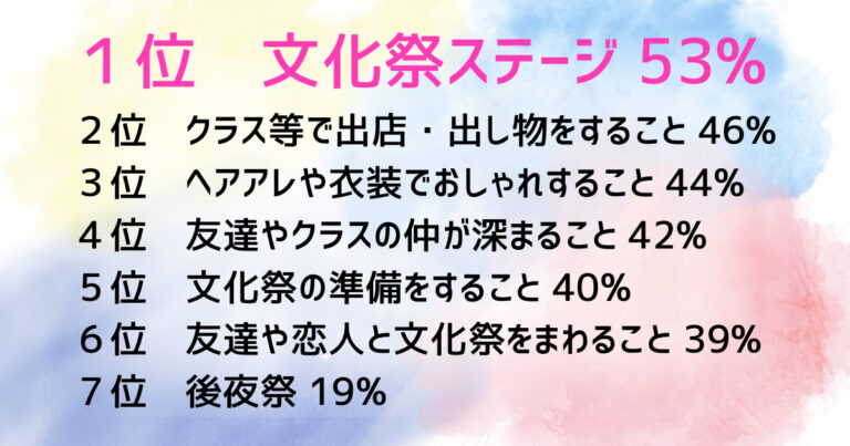 文化祭で楽しみなこと1位は「文化祭ステージ」。ダンスやバンド、演劇など…クラスや部活ごとに披露するステージは青春そのもの!2位も「出店・出し物」とみんなで作り上げる系が上位にランクイン。