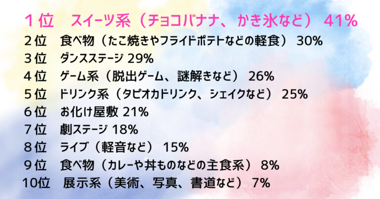 クラスの出し物の人気No.1は”スイーツ系の出店”。みんな大好きスイーツは作っても楽しい&余ったら食べられるのが圧倒的人気の理由みたい。「推しのK‐POPやアイドルの曲をステージで踊りたい!」という子も多く、ダンスステージが3位にランクインする結果に。みんなのエピソードから参考になるアイデアを探してみて♪