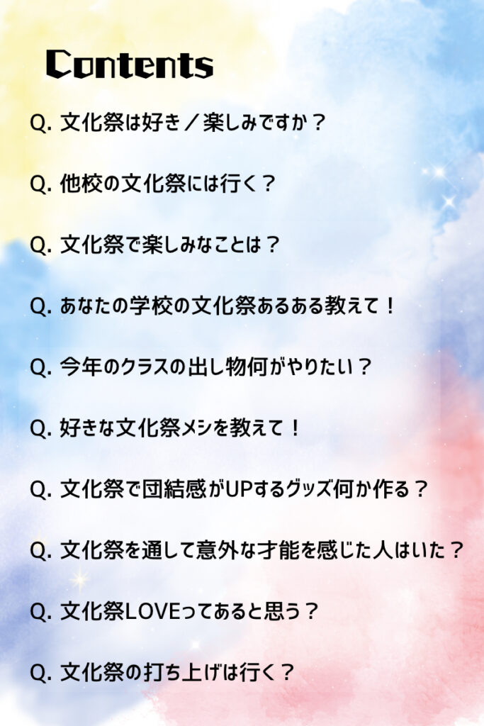 文化祭は中高生にとって一生の思い出になる青春の一大イベント♡この記事では、中高生287人が選ぶ人気の出し物や食べ歩き必須の文化祭メシ、さらに文化祭ラブが詰まった恋バナまで文化祭の楽しみ方をぜーんぶ大公開!準備から当日まで、友達とワイワイ盛り上がるコツやアイデアが満載だから、記事をチェックして来たる文化祭を大成功させちゃお!