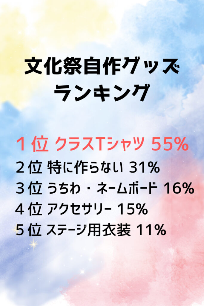 なんと半数以上の子が文化祭で「クラスTシャツ」を作るみたい。Tシャツはユニフォーム風にしたり背中にみんなからの寄せ書きを入れたりとデザインも自由自在!みんなでおそろで着れば、準備から当日まで一気に団結感が高まりそう♪