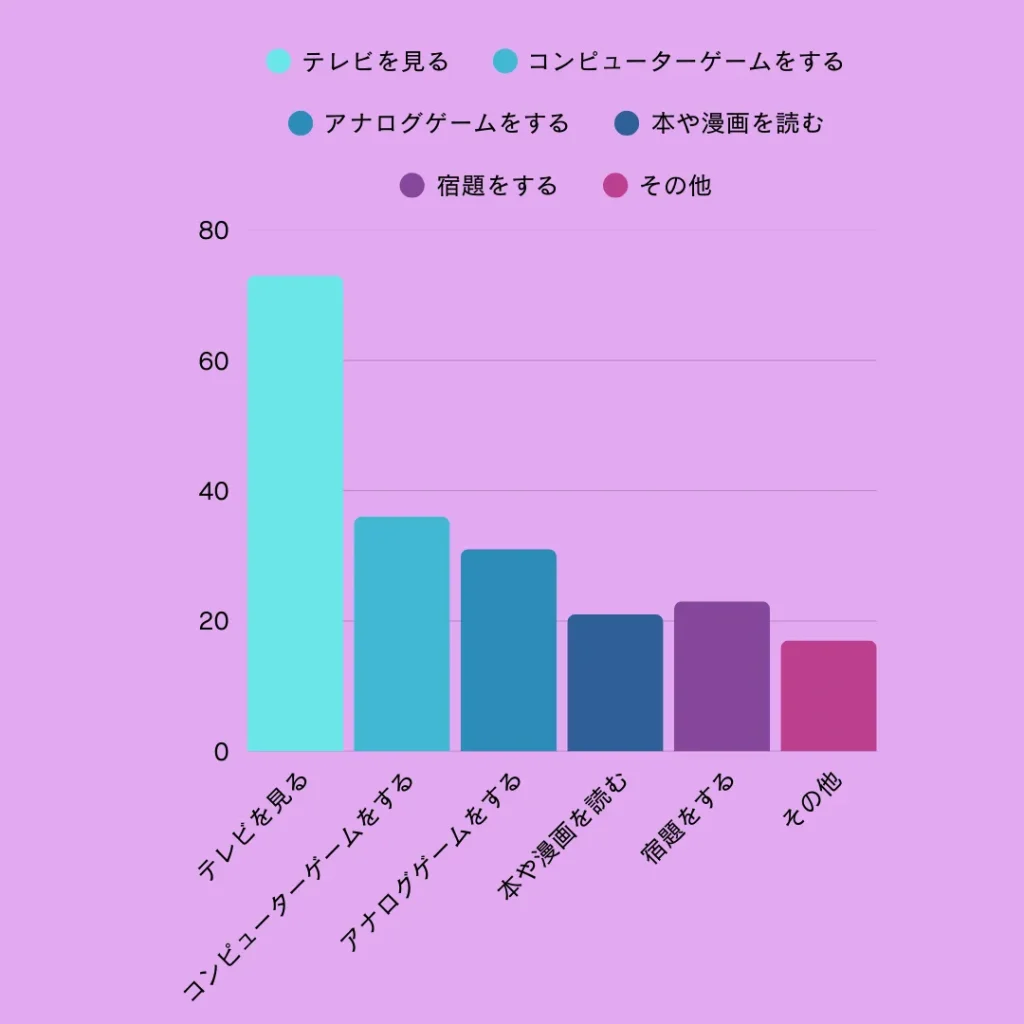 テレビ番組を家族で観るのが鉄板の過ごし方。ゲームは、ひとりプレイやオンラインでの友だちととの交流、いとこやきょうだいとアナログゲームを楽しむなど多様です。「その他」では、動画視聴という声が多く、自宅でゆっくりと過ごす傾向が強く見られました。