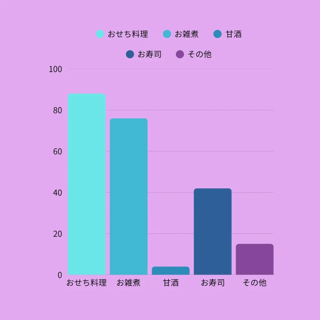 おせちやお雑煮といった定番メニューは、やはり人気。「その他」では、お刺身、すき焼き、カニ、きなこもち、お汁粉など、ごちそう感やお正月感のある料理が多く、特別さを大切にしている様子が見られました。