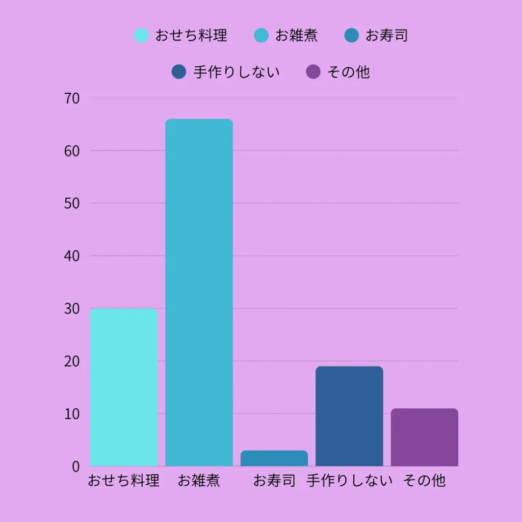 最も多かったのは、お雑煮。気軽に取り入れやすいお正月料理で、家庭ごとの味がある点も支持を集めた理由のようです。