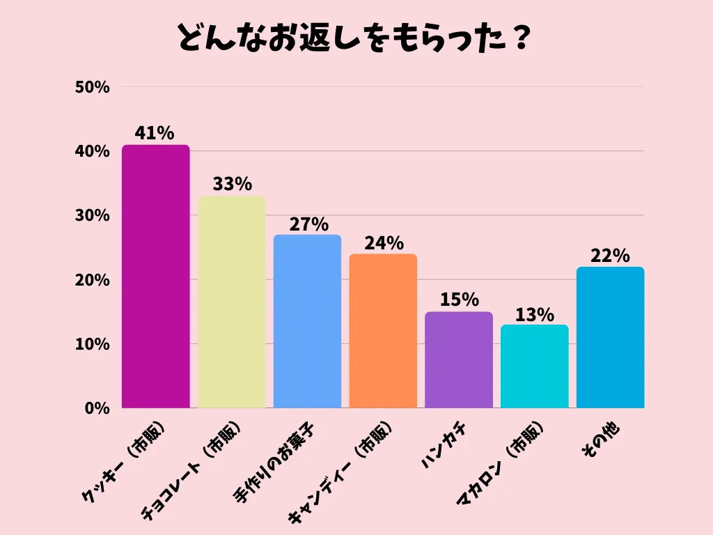 お返しは市販のクッキーチョコレートが中心でした。「その他」では、文房具という回答が多く、ハンカチなどとあわせて実用的なアイテムも挙がりました。相手に気を遣わせすぎない、ちょうどいい距離感のお返しが選ばれている印象です。