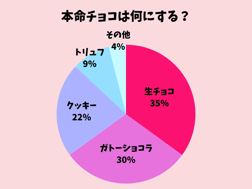 生チョコガトーショコラが上位に。高級感や手作りでも失敗しづらいといった理由から、本命向けとして選ばれているようです。クッキー派も一定数いました。普段から作るような身近なお菓子だからこそ、気持ちと自信が込められるのかも。