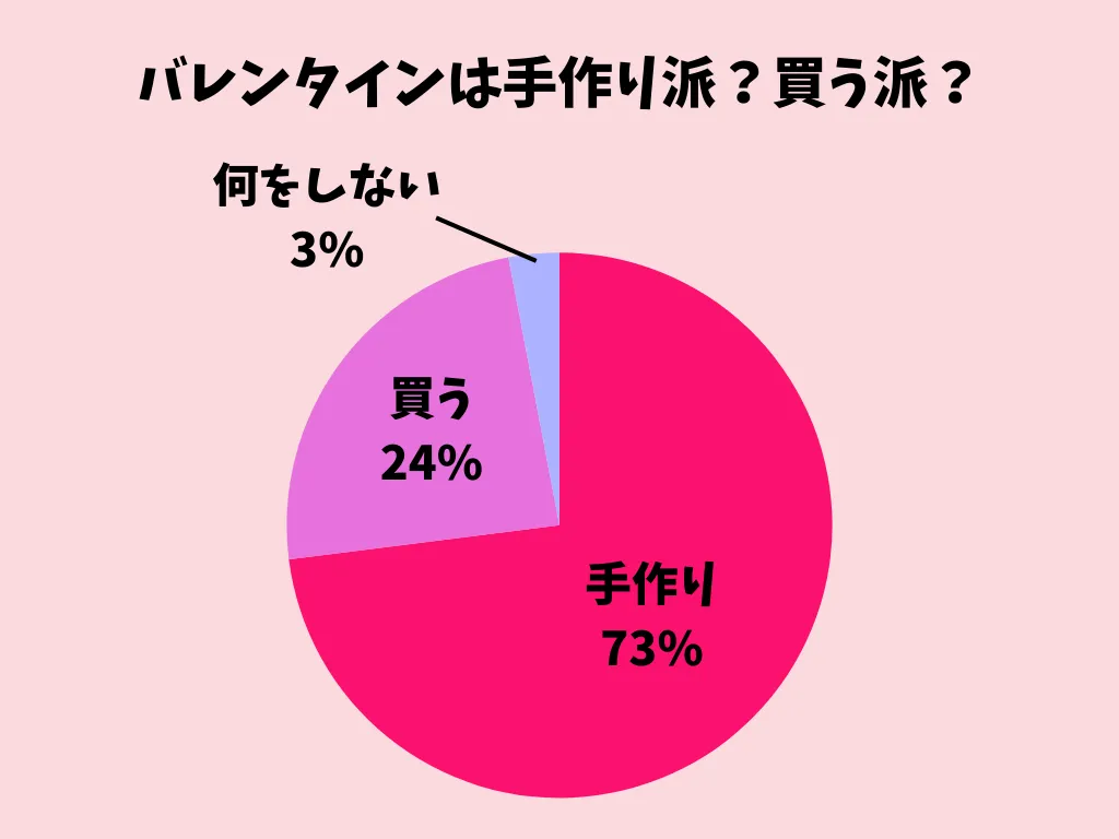 手作り派が73%と多数派に。イベントとしてバレンタインを楽しみたい気持ちが伝わってくる結果となりました。一方で買う派は、かわいいチョコを自分や友だち同士で選ぶ楽しさを重要視している様子がうかがえました。