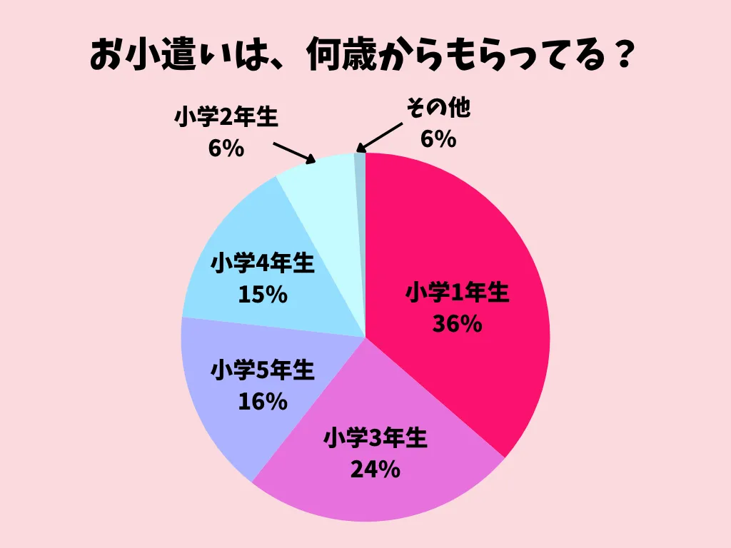 最も多かったのは、小学1年生からという声でした。全体として低学年のうちにお小遣いをスタートしている家庭が多い傾向が見られます。また、小学6年生になるころには、ほとんどの子がお小遣いをもらっている状態となっていました。