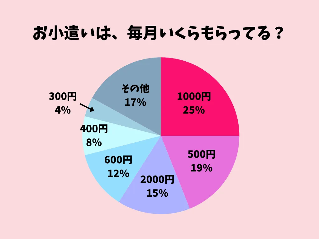 ボリュームゾーンは1000円という結果に。次いで500円、2000円と続き、家庭によって幅はあるものの、500〜2000円の間に集中している傾向が見られました。学年や使い道に応じて金額を調整しているケースも多く、無理のない範囲で設定されている様子が伺えます。
