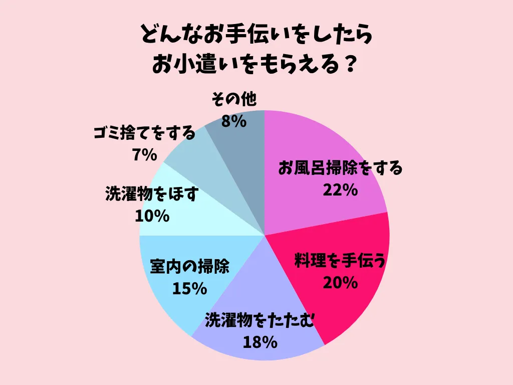 お風呂掃除や料理の手伝いなど、日常的な家事が多く挙がりました。その他には、食器洗いやおつかい、ペットのお世話、マッサージなど、家庭ごとにさまざまなお手伝いが設定されているようです。