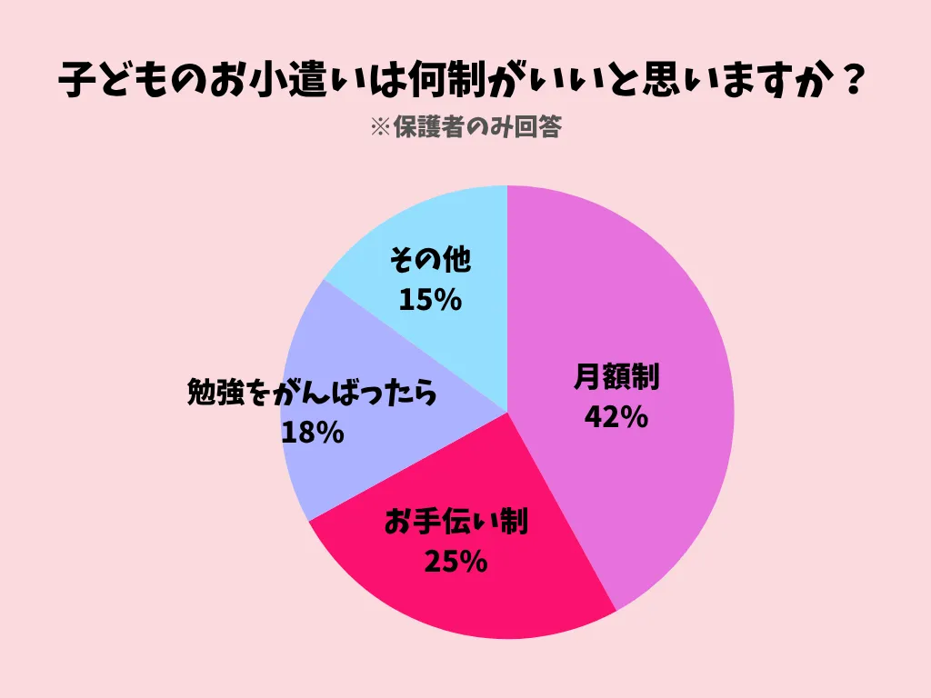 保護者でも月額制が最も多い結果に。一方で、お手伝いや勉強と連動させるなど、家庭ごとに考えの違いも見られました。その他では申告制が圧倒的に多く、子どもの成長に合わせて柔軟に対応している家庭が多いようです。